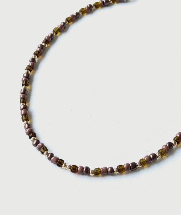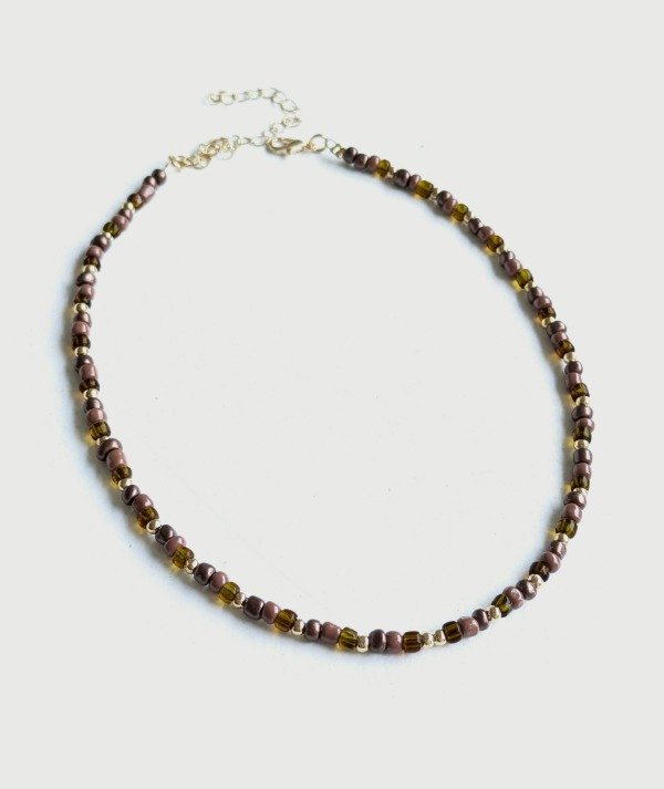 Collar corto con mini cuentas de vidrio en color cobre, ambar, tierra y separadores dorados.