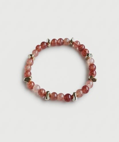 Pulsera elástica con piezas de vidrio en color coral suave traslúcido y separadores de acrílico con baño dorado | Armadas a mano.