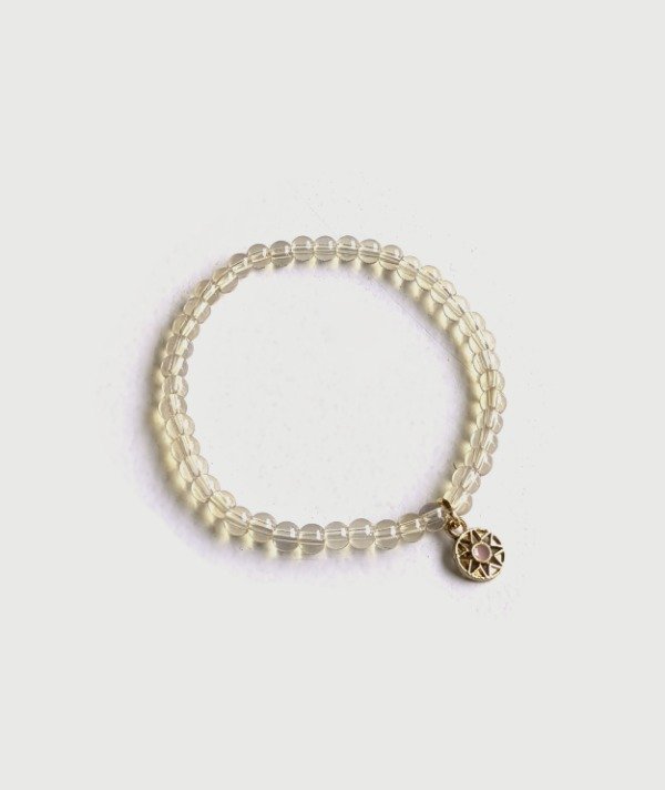 Pulsera elástica con piezas mini de vidrio en color manteca traslúcido y detalle de dije en color dorado con centro esmaltado | Armadas a mano.